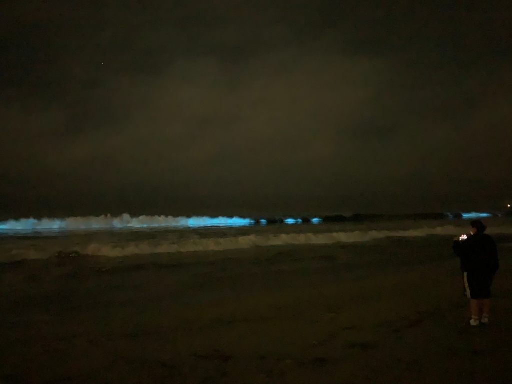 Out of the smooth void of the water suddenly exploded a flash of blue lightning followed by the thunder of the selfless waves. A streak of electrifying, vibrant blue burst forth from the two ends of the shoreline, racing toward the middle and lighting up the leading edge of the wave that was rushing toward us from the depth of the sea.
